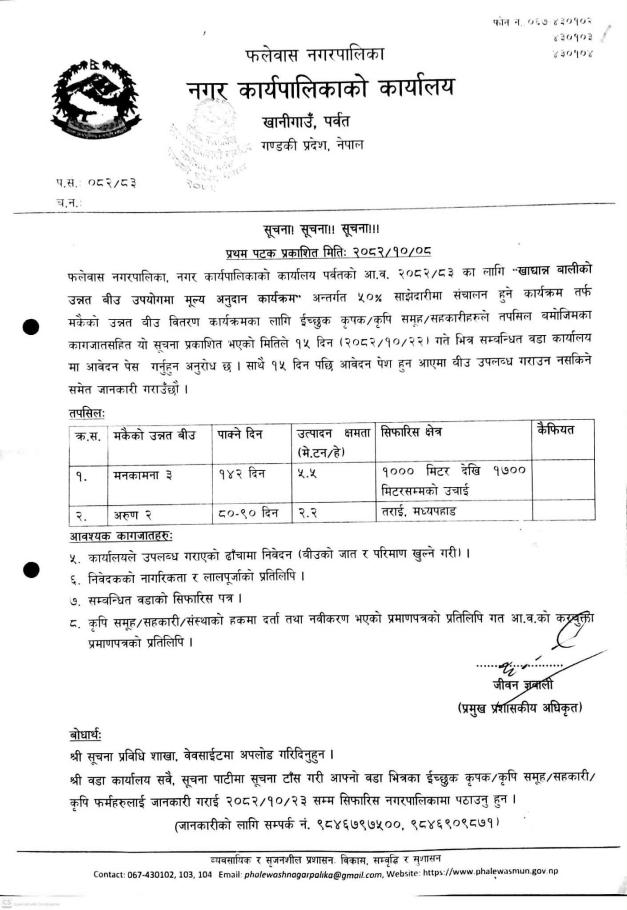 अनुदानमा उन्नत मकैको बीउ माग गर्ने सम्वन्धी सूचना !