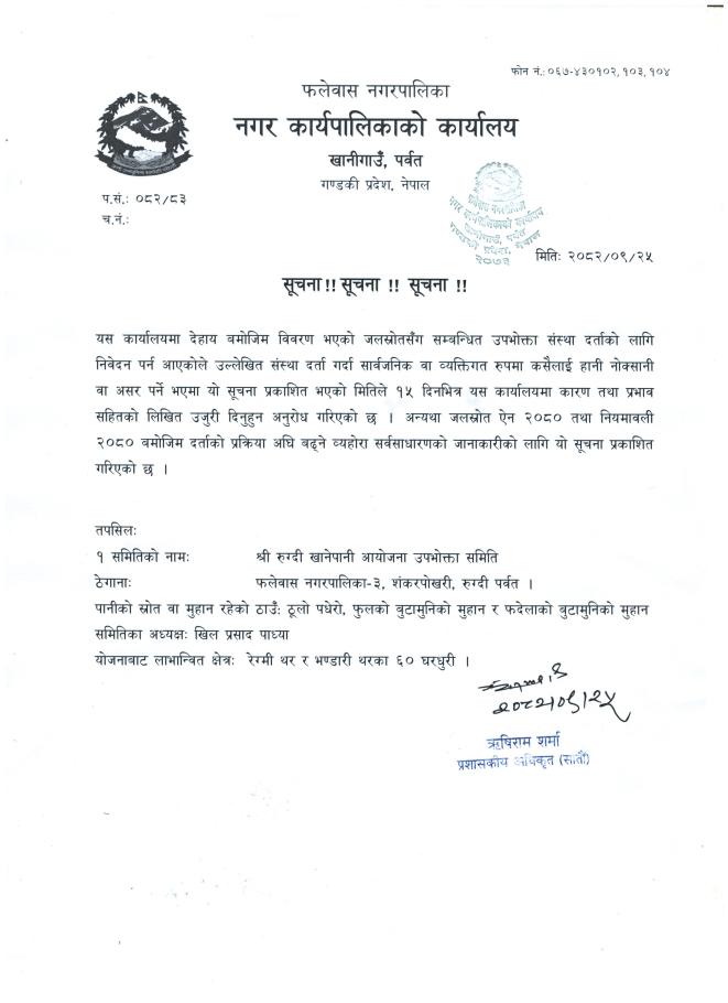 जलश्रोत उपभोक्ता संस्था दर्ता सम्वन्धमा दावी विरोध सम्वन्धी सूचना !