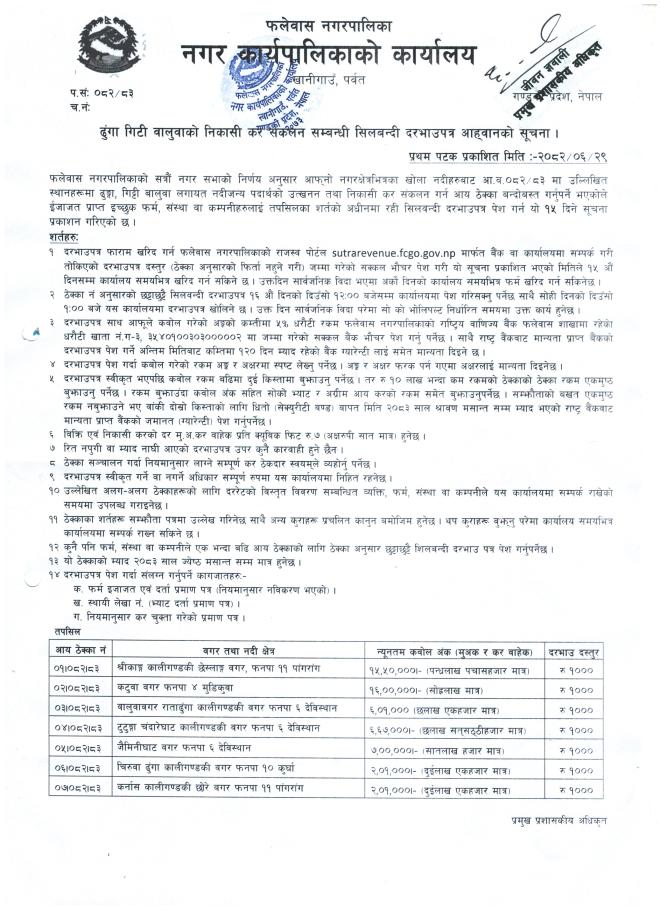 ढुंगा गिट्टी र वालुवाको निकासी कर संकलन सम्वन्धी सिलबन्दी दरभाउपत्र आह्वानको सूचना !