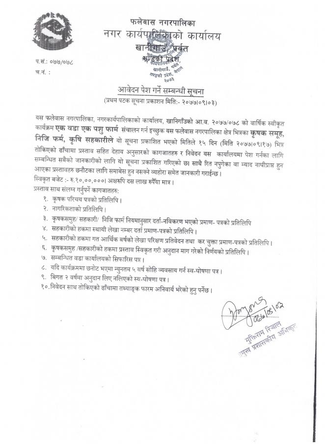 एक वडा एक पशु फर्म संचालनको लागि आवेदन पेश गर्ने बारे सूचना |