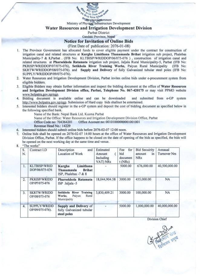 जलश्रोत तथा सिंचाई विकास डिभिजन कार्यालय, पर्वतद्वारा प्रकाशित सूचना ।