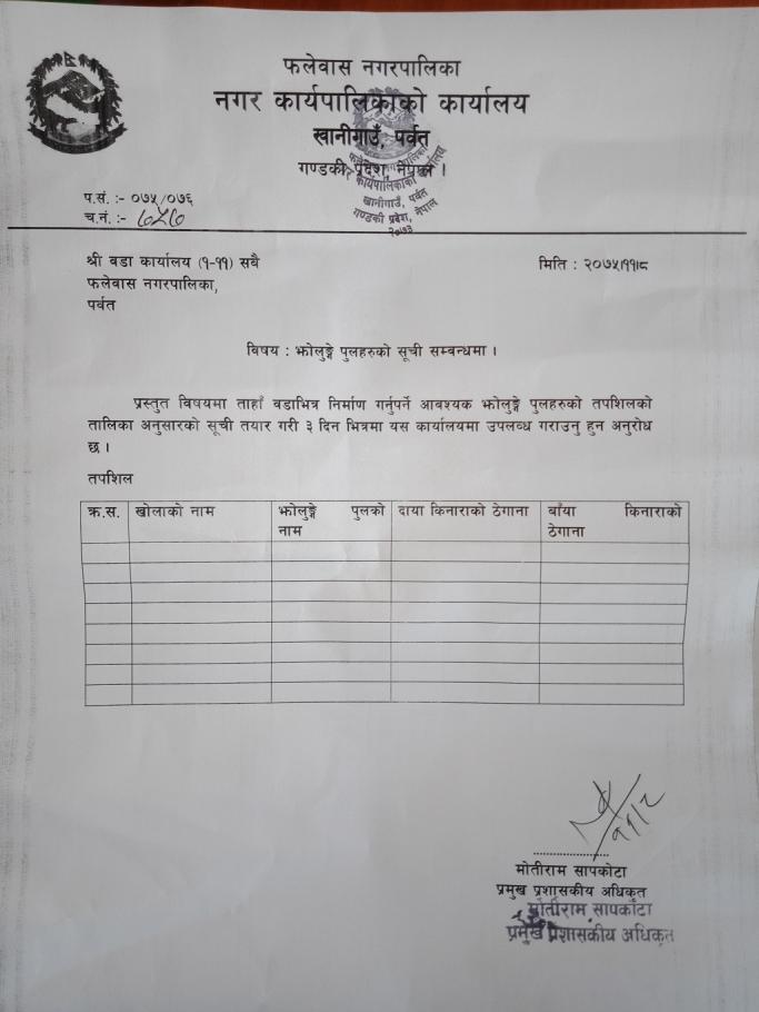 झोलुंगे पुलहरुको सूची पठाउने सम्वन्धमा (फ.न.पा. स्थीत वडा कार्यालयहरु) ।