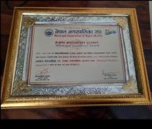 देशभरकै उत्कृष्ट नगरपालिकाको कदर पत्र ग्रहण गर्नुहुदै नगर प्रमुख श्री पदमपाणी शर्मा ।