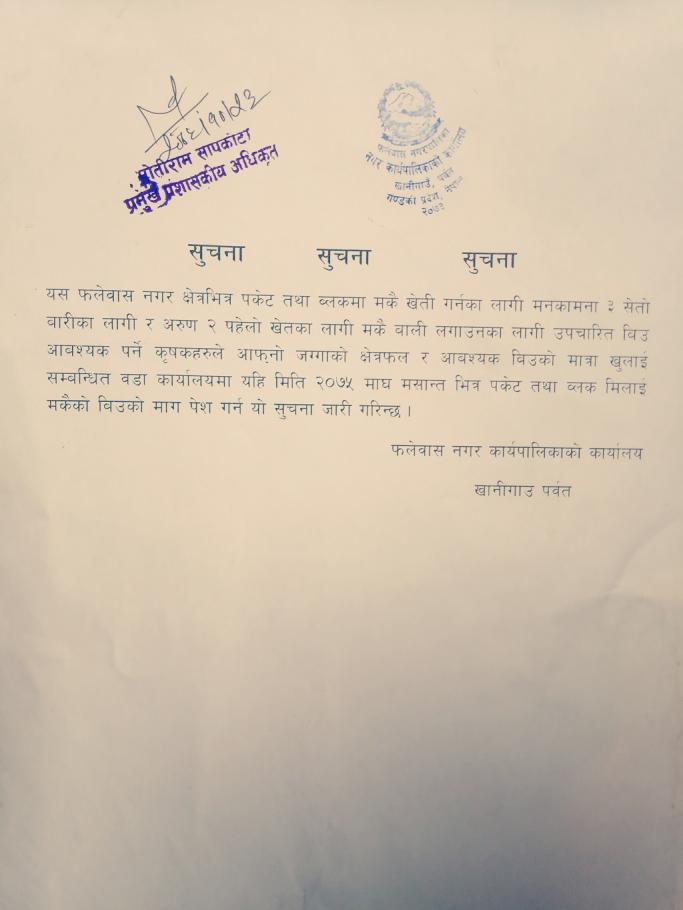 फलेवास नगरपालिका अन्तर्गतका कृषकवर्गहरुलाई सूचना ।
