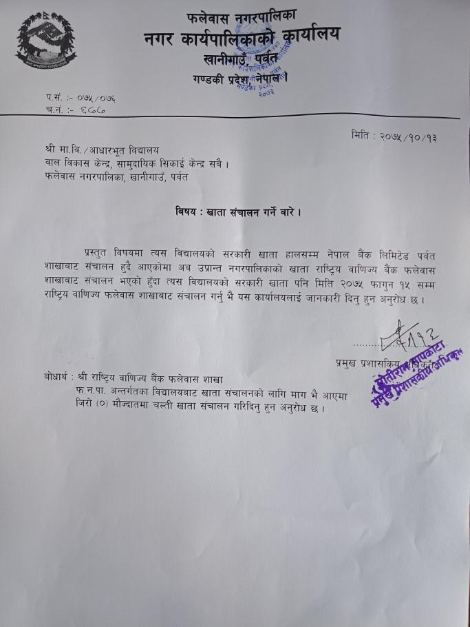 फलेवास नगरपालिका अन्तर्गतका सामूदायीक विद्यालयहरुलाई सूचना ।