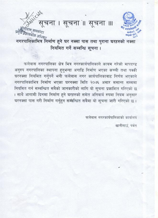 » फलेवास नगरपालिका भित्र निर्माण हुने घर, नक्सा पास तथा पुराना घरहरुको नक्सा नियमित गर्ने सम्वन्धी सूचना