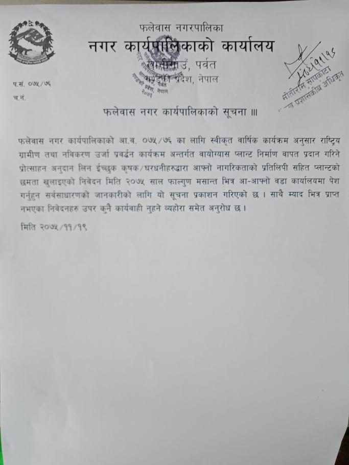 » फलेवास नगर कार्यपालिकाको सूचना ।।।