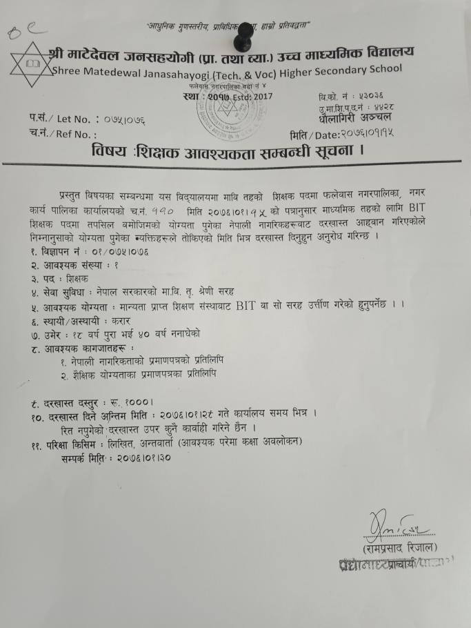 शिक्षक आवश्यकता सम्वन्धी अत्यन्त जरुरी सूचना (B.IT वा सो सरहको) ।
