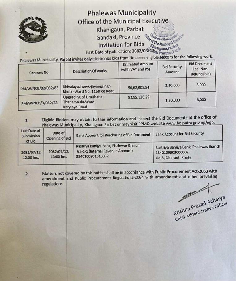 » सडक निर्माण तथा स्तरोन्नतिका लागि बोलपत्र आह्वानको सूचना !