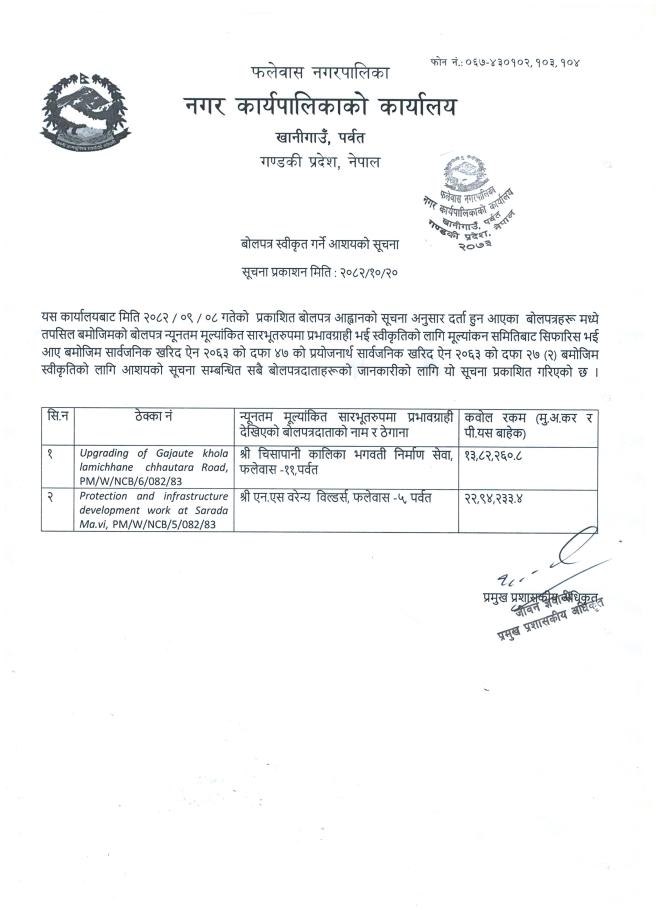 सडक स्तरोन्नती तथा विद्यालय पूर्वाधार निर्माण सम्वन्धी बोल पत्र स्वीकृत गर्ने आशयको सूचना !