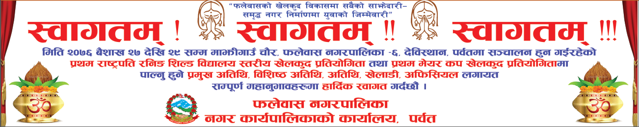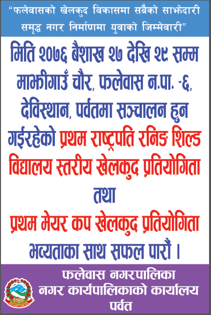 » २०७६ साल वैशाख २७ गतेदेखि २९ गतेसम्म राष्ट्रपति रनिङ शिल्ड तथा प्रथम मेयर कप खेलकुद प्रतियोगिता आयोजना हुँदै ।